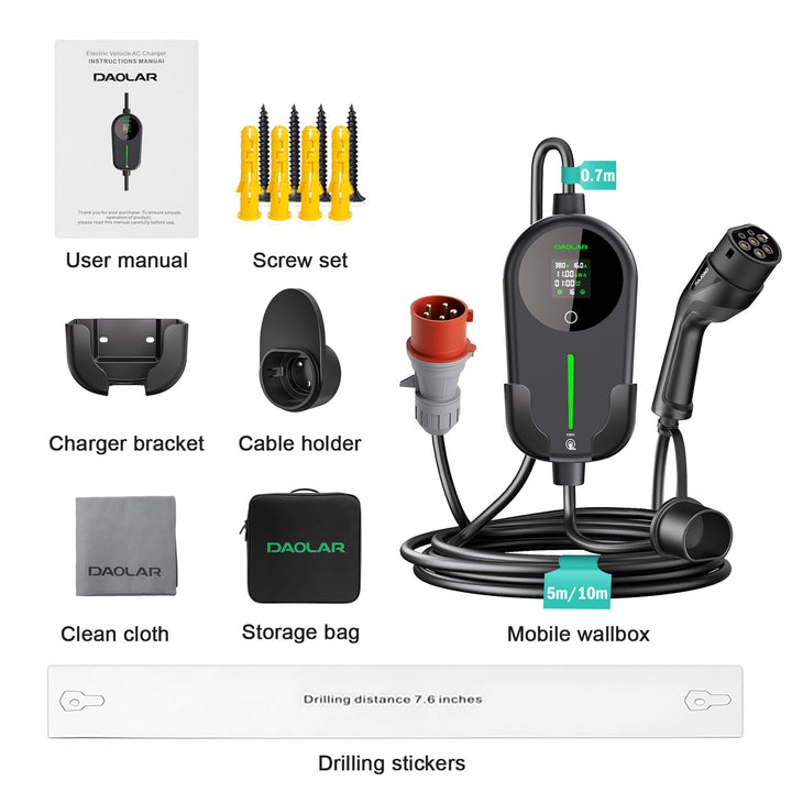 [Flagship] Daolar Mobile Wallbox 11 kW com contador de eletricidade, cabo de carregamento trifásico tipo 2 de 6-16 A com carga ajustável em kWh, estação de carregamento à prova de água IP65