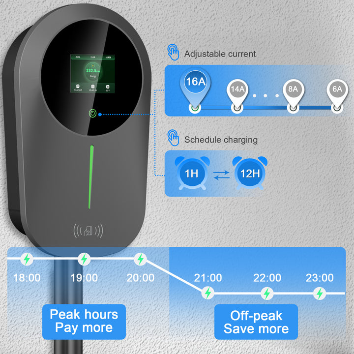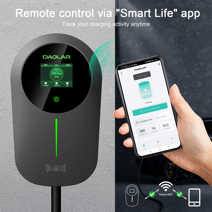 O carregador Wallbox suporta carregamento programado de 0 a 24 horas, permitindo definir os horários de carregamento para iniciar automaticamente fora das horas de ponta à noite, reduzindo os custos de eletricidade. Com o controlo remoto da aplicação Smart Life, pode gerir facilmente cada sessão de carregamento, tornando a condução ecológica mais económica e eficiente.