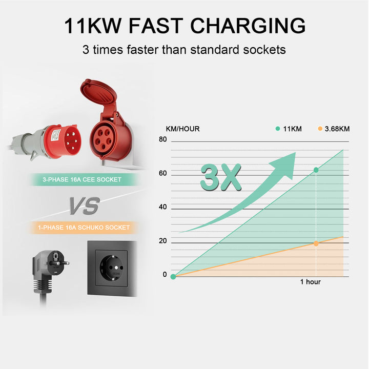 Com 11KW (3 Fases, 16A) carregamento rápido com capacidades, o seu VE estará pronto para usar em pouco tempo. Passe menos tempo à espera e mais tempo a conduzir. Compatível com todas as tomadas de carregamento Tipo 2 / IEC62196, especialmente aquelas que suportam carregamento trifásico.