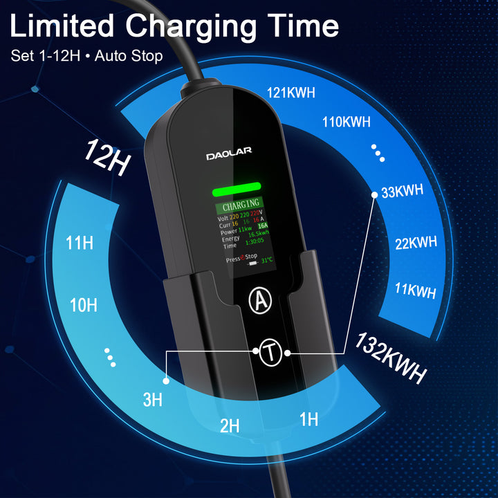 - ⏱ Carregamento por Agendamento (1-12H): Defina o seu carregador para iniciar a uma hora específica, aproveitando as tarifas de eletricidade fora do pico para poupanças máximas.