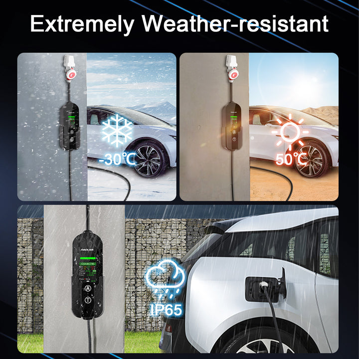 Concebido com os mais altos padrões, o Daolar YUQ1 apresenta uma construção robusta Classificação à prova de água e poeira IP65, tornando-o adequado tanto para uso interior como exterior. Equipado com tecnologia avançada Proteção contra fugas RCD Tipo A (AC 30mA), a sua segurança e a proteção do seu veículo estão garantidas. Certificado com CE e RoHS para a sua tranquilidade.