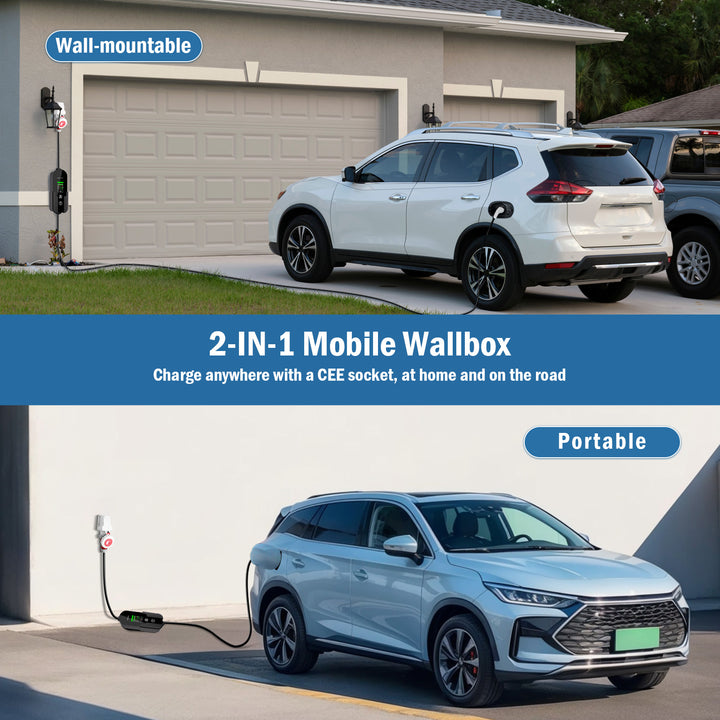 Apresentando um padrão Ponta de carregador Tipo 2 / IEC62196 e um Plug CEE trifásico 16A, esta wallbox móvel oferece alta compatibilidade com todos os veículos elétricos Tipo 2 em toda a UE. O visor eletrónico luminoso oferece um estado de carregamento claro num relance. Escolha entre comprimentos de cabo convenientes: 3m, 5m ou 10m.
