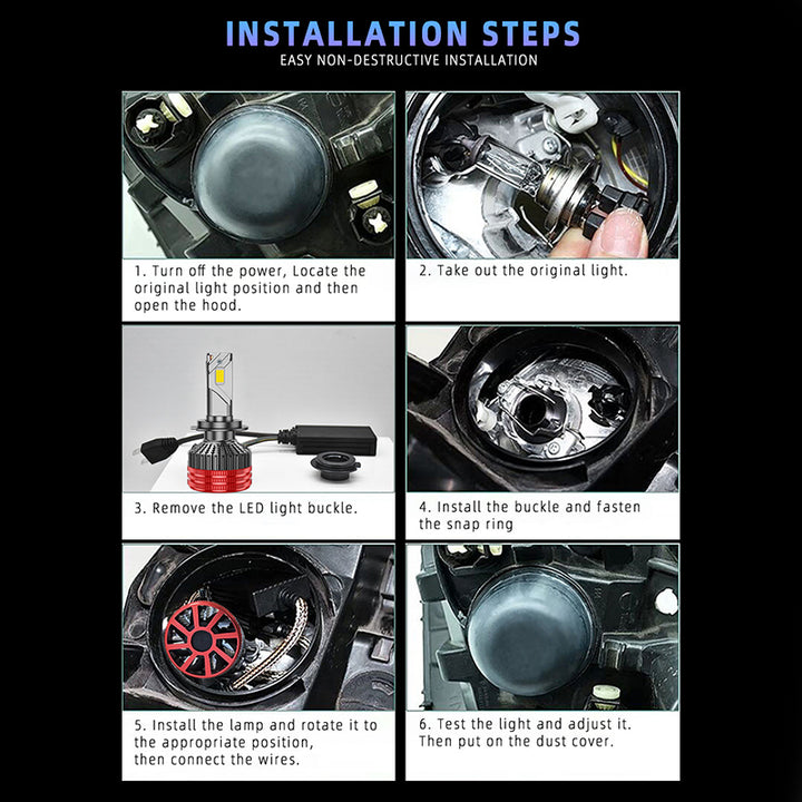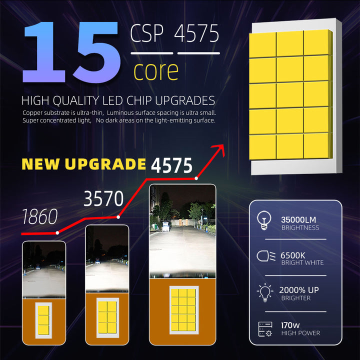 BRILHO EXTREMO COM 15-CORE CSP 4575 CHIPS: Desenvolvido com a mais recente tecnologia de LED 15-core CSP 4575, este kit de faróis oferece impressionantes 35.000 Lumens e 170W de potência por conjunto. Com uma temperatura de cor branco frio de 6500K, estas lâmpadas são 2000% mais brilhantes do que os halogéneos padrão, proporcionando um alcance de iluminação mais amplo e mais distante para eliminar áreas escuras na estrada.