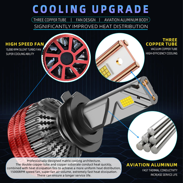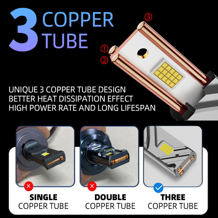 SISTEMA REVOLUCIONÁRIO DE ARREFECIMENTO COM 3 TUBOS DE COBRE: Ao contrário das lâmpadas padrão que usam tubos de calor simples ou duplos, este modelo apresenta um design exclusivo com 3 tubos de cobre para uma condutividade térmica superior. Combinado com um corpo em alumínio aeronáutico e um ventilador turbo silencioso de 15.000 RPM, a arquitetura de arrefecimento em matriz previne eficazmente o sobreaquecimento, garantindo uma saída de alta potência estável e uma vida útil significativamente mais longa.